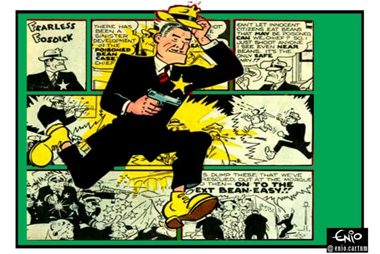 Joe Cometa” é um personagem bronco criado pelo quadrinista americano Al Capp, e uma das historietas mais famosas desse anti-herói bizarro é “O caso dos feijões envenenados”. Naquela HQ, Fearless Fosdick (nome original em inglês) combate um terrorista que colocou uma lata de feijões envenenados no meio de milhares de embalagens em boa qualidade. Para impedir que alguém venha a morrer comendo dessa latinha contaminada, Joe Cometa sai matando qualquer vivente que esteja prestes a colocar um caroço de feijão na boca (!). Ele cria um grupo “de salvação” e, em equipe, matam às tuias para evitar que alguma pessoa possa morrer envenenada.