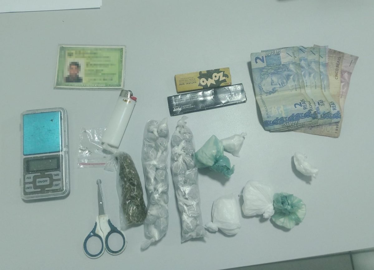 O acusado levava uma sacola onde foram encontrada maconha, cocaína, balança de precisão e dinheiro.