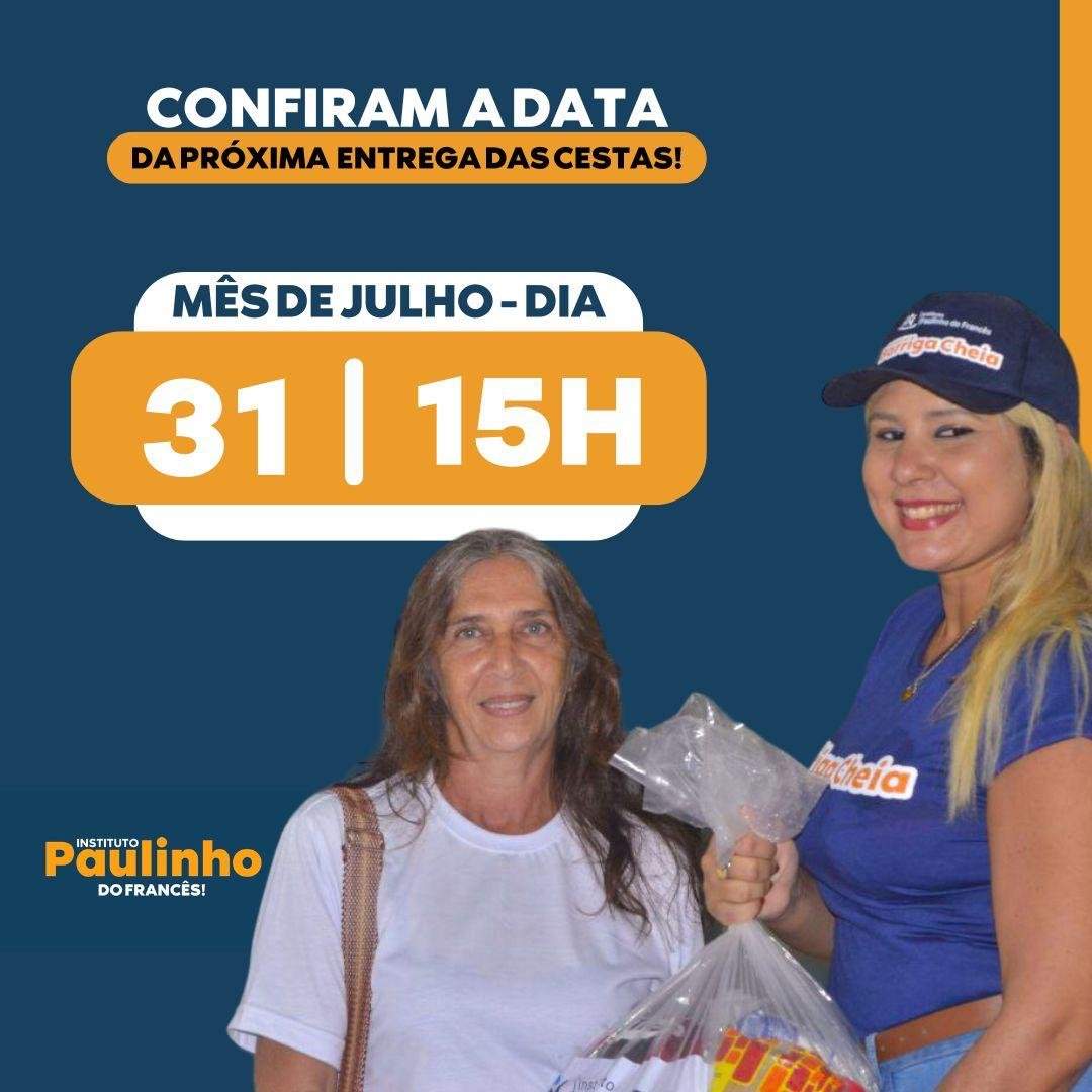 A quinta entrega das cestas básicas do Programa Barriga Cheia já tem data definida. Na quarta-feira, 31 de julho, às 15h, o Instituto Paulinho do Francês convocou as famílias aprovadas no Programa. As entregas serão realizadas na sede da Organização Não Governamental (ONG), localizada em frente à quadra de esportes, na Terra da Esperança.