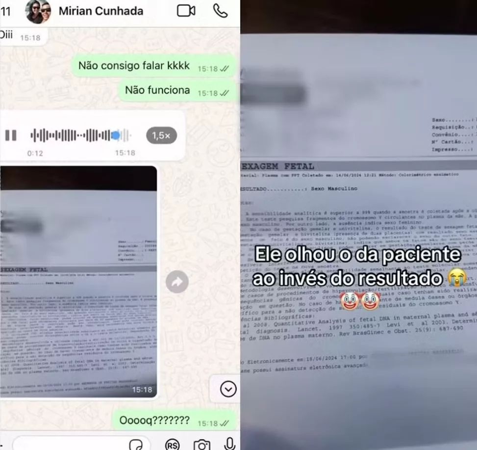 “Ele abriu o resultado e minha amiga também abriu. Ela ainda circulou para ele onde estava o sexo da minha cunhada e mandou: ‘é menina!’. E como minha amiga mandou, ele nem se interessou em ler o restante, para baixo”.