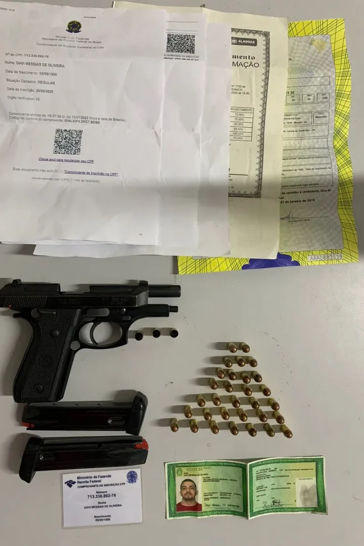 Na abordagem, foi apreendida uma pistola Taurus calibre .380, dois carregadores e 31 munições do mesmo calibre. Também foi apreendido com o indivíduo um Registro Geral (RG) e um comprovante de CPF que estavam em nome de outra pessoa, o que indica a possibilidade de se tratar de um documento falsificado.