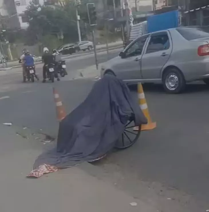Com a suposta demora, o filho decidiu colocar o corpo da mãe na cadeira de rodas e levá-lo até o Centro de Referência de Assistência Social (CRAS) da Praça Seca. Quando ele estava saindo de casa, ele contou que foi abordado por criminosos, que teriam dito que ele teria matado a mãe. Ele alega que foi agredido durante a abordagem.