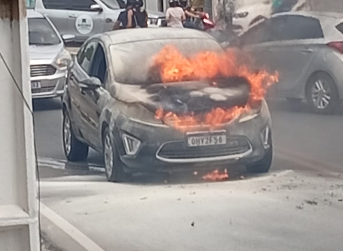 Um veículo Ford Fiesta sedan pegou fogo no início da tarde desta terça-feira, 22, em um trecho da rua Dom Pedro II, no bairro Ouro Preto, em Arapiraca.