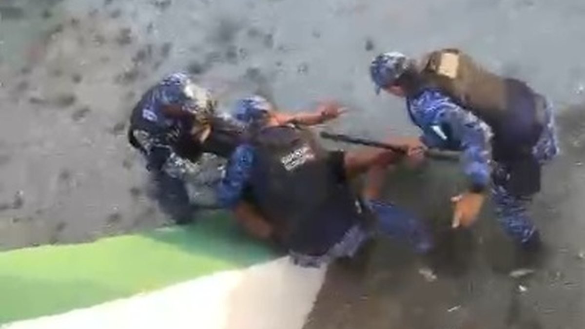 As imagens mostram o trio batendo com um cacetete no homem, que está sendo encurralado contra uma das pilastras da arquibancada. Depois de algum tempo, um integrante da equipe da casa se aproxima, mas logo vai embora. Na sequência, jogadores e parte da comissão do Zumbi tentam apartar a agressão.