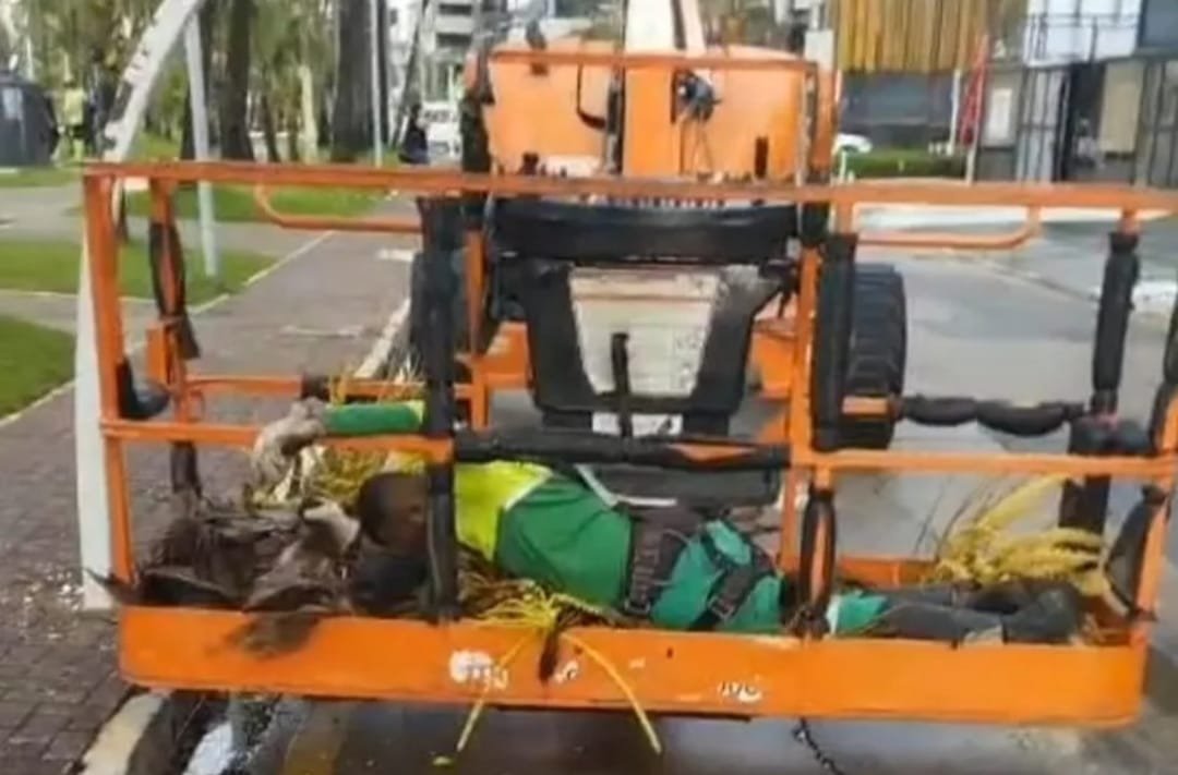 Segundo relatos de testemunhas, o braço mecânico de uma plataforma elevatória apresentou falha técnica enquanto dois trabalhadores executavam o serviço. A estrutura despencou repentinamente, atingindo o solo com força e colidindo com uma placa de sinalização.