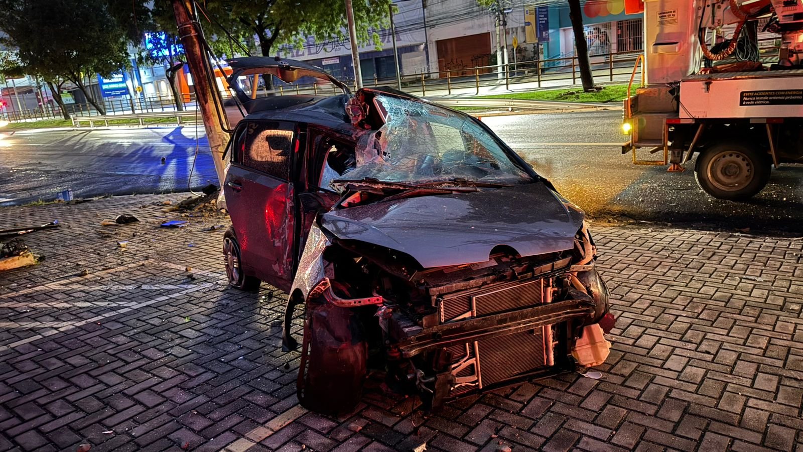 O veículo, modelo não identificado, teve danos severos em toda a estrutura: lataria retorcida, vidros estilhaçados, teto parcialmente afundado e pneus danificados. A força do impacto também comprometeu a base do poste, que ficou inclinado e precisou de intervenção técnica urgente.