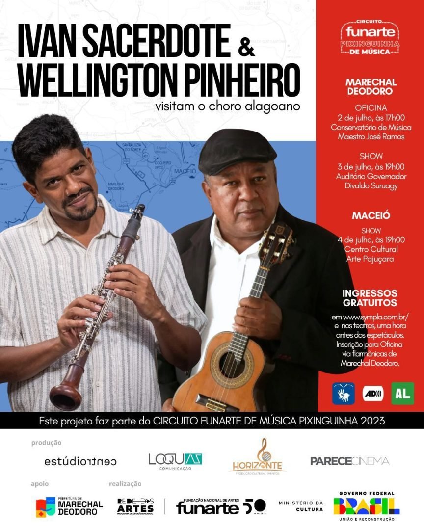 Jovens músicos das filarmônicas de Marechal Deodoro terão um papel de protagonismo em uma iniciativa inédita liderada por Ivan Sacerdote, um dos principais clarinetistas do Brasil, e pelo cavaquinista e bandolinista alagoano Wellington Pinheiro. A dupla realiza, de 2 a 4 de julho, uma oficina e dois shows com participação ativa desses jovens, selecionados entre as tradicionais sociedades musicais da cidade. As atividades promoverão um diálogo do choro produzido no estado com clássicos nacionais.