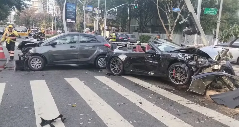 O carro conversível, avaliado em cerca de R$ 1 milhão, ficou completamente destruído após a batida na Avenida Brigadeiro Faria Lima, em São Paulo, na quarta-feira (20).