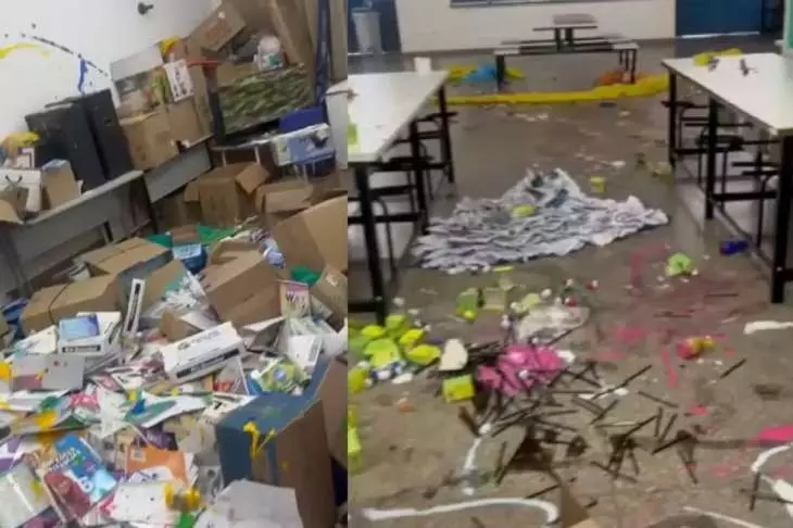 Imagens gravadas dentro da escola mostram paredes e chão pichados, além de móveis e objetos danificados. Entre os desenhos feitos no local, há imagens obscenas e xingamentos.