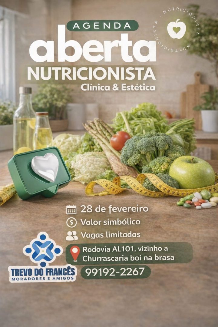 A Associação de Moradores do Francês realizará, no próximo dia 28 de fevereiro, uma importante ação voltada à promoção da saúde e bem-estar da comunidade. A iniciativa contará com consulta com Nutricionista, oferecendo atendimento profissional com valor simbólico, facilitando o acesso da população a orientações especializadas.