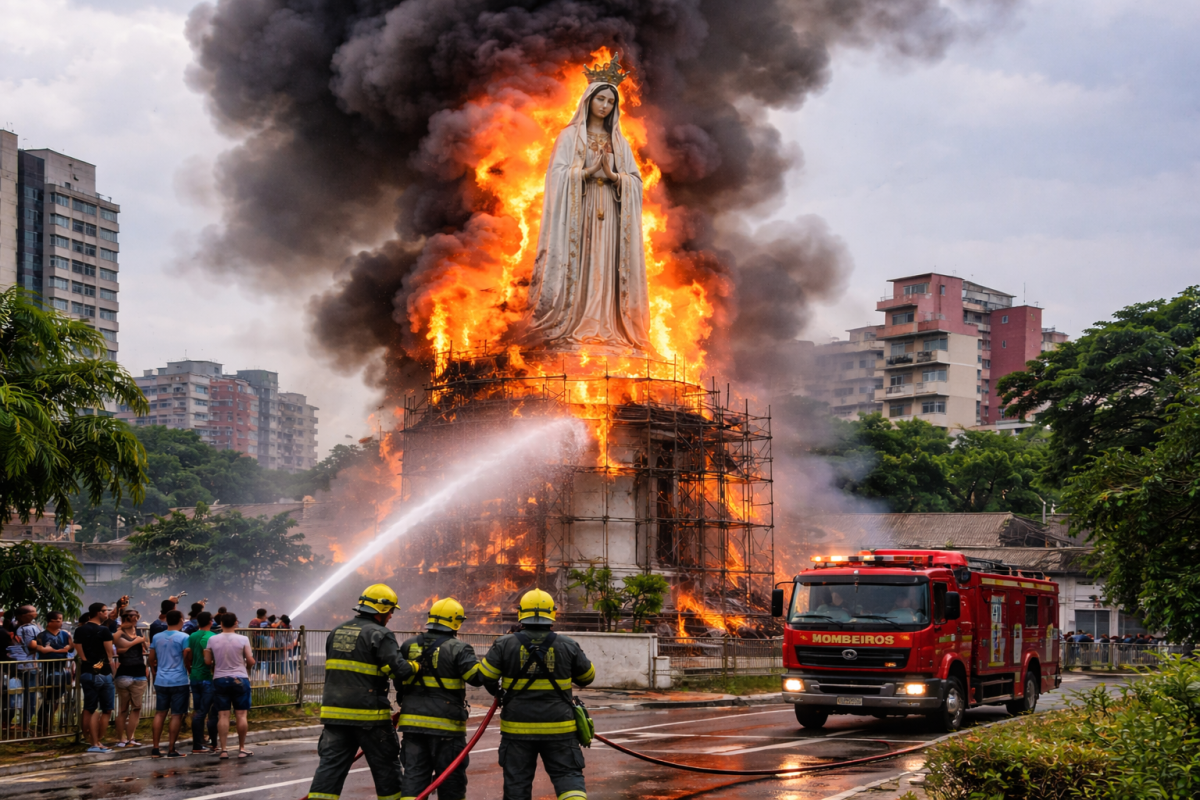 Um incêndio registrado na tarde desta terça-feira (24) atingiu uma imagem de Nossa Senhora de Fátima no conjunto Parque das Dunas, na Zona Norte de Natal. As chamas chamaram a atenção de moradores da região e imagens do momento passaram a circular nas redes sociais, mostrando a estrutura envolvida pelo fogo.
