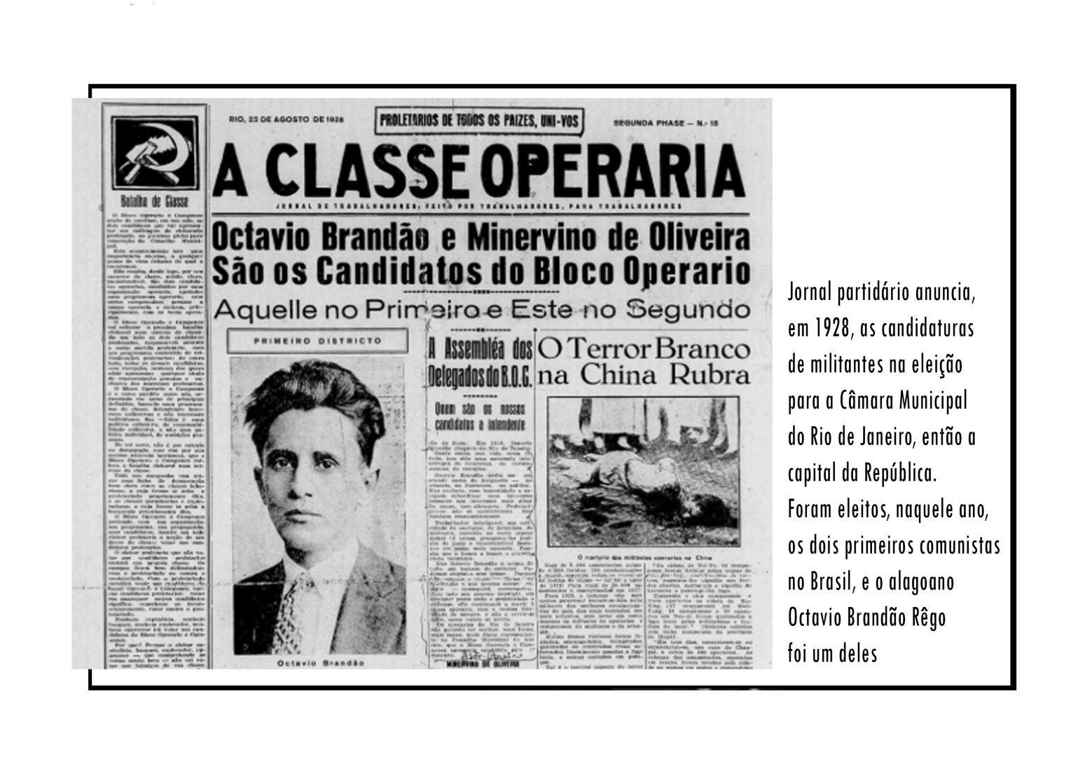 COMUNISTAS DE ALAGOAS sempre se destacaram no cenário brasileiro, como Graciliano Ramos e Nise da Silveira; Octavio Brandão, autor da primeira tradução no Brasil do Manifesto Comunista e primeiro parlamentar comunista eleito em nosso País; Arthur Ramos, mesmo sem ser militante orgânico, foi classificado como “comunista” pelos Estados Unidos e teve sua carreira prejudicada na ONU por isso. Como presidente da UNE, presidente da Câmara dos Deputados, ministro do Esporte, da Ciência e Tecnologia, da Articulação Política, e da Defesa, Aldo Rebelo honrou e projetou a sigla PCdoB como poucos; Eduardo Bomfim, como deputado federal e como secretário-executivo do ministério da Articulação Política deixou importante contribuição nacional; e muito mais nomes podem ser lembrados nesse item, como os irmãos Motta Lima e tantas outras personalidades notáveis. Em resumo: Alagoas deve se orgulhar de sua participação nessa longa história de 104 anos, e que está apenas em seu começo.