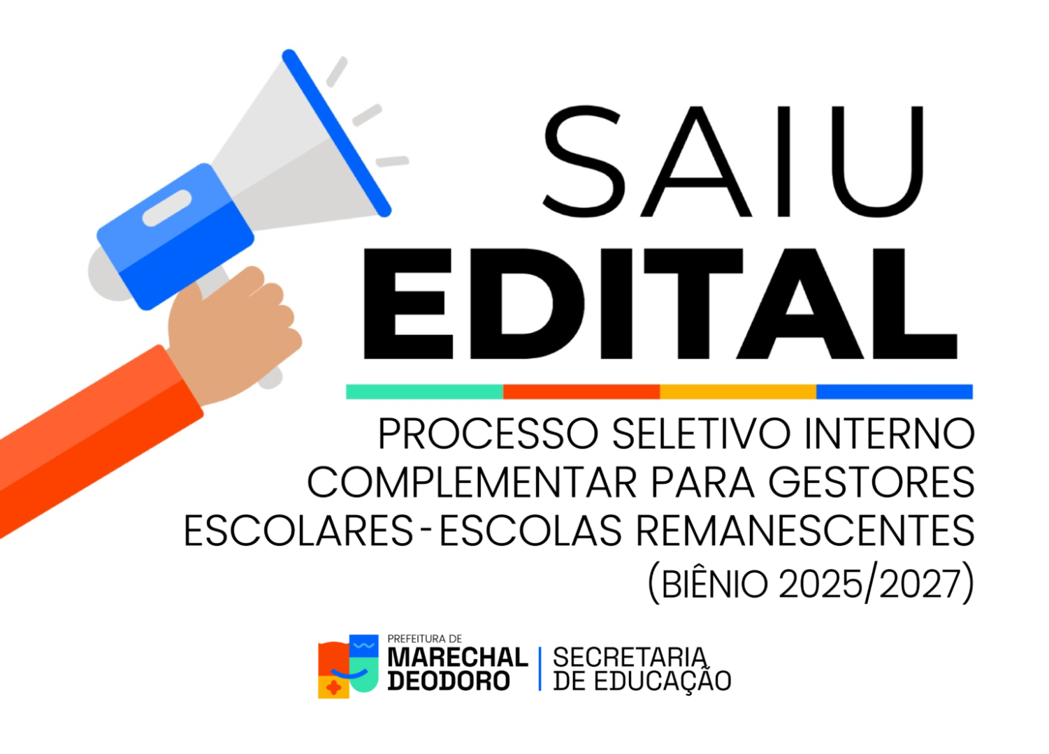 A Prefeitura de Marechal Deodoro, por meio da Secretaria Municipal de Educação, divulga nesta segunda (02) o edital que regulamenta o Processo de Seleção Interna Complementar para provimento das funções de Diretor(a) e Diretor(a) Adjunto(a) das unidades escolares remanescentes, que não tiveram gestores aprovados no certame anterior.