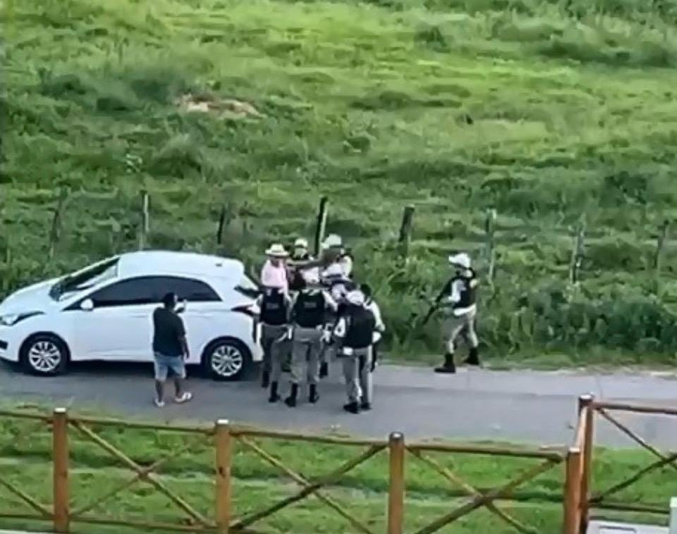 Nas imagens, é possível observar os agentes cercando o condutor, que usa chapéu, enquanto tentam realizar a abordagem. Em determinado momento, a situação se intensifica e pelo menos quatro policiais são necessários para conter o homem, que é derrubado no chão e algemado.