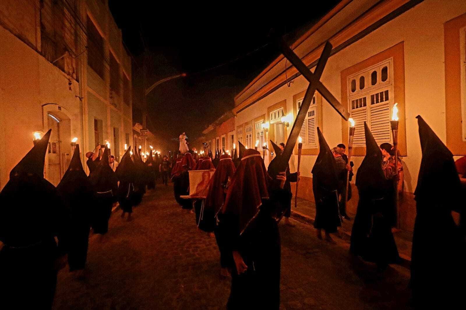 Durante a procissão, mais de 100 homens encapuzados percorrem as ruas do Centro Histórico carregando tochas de fogo, em um cenário único e impactante. Todas as luzes da região são apagadas, e o trajeto passa a ser iluminado exclusivamente pelas chamas, criando uma atmosfera de profunda reflexão e espiritualidade.