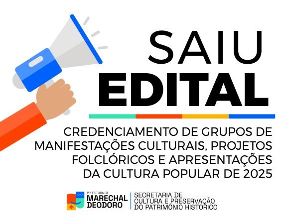 A Prefeitura Municipal de Marechal Deodoro, por meio da Secretaria Municipal de Cultura e Preservação do Patrimônio Histórico, anunciou a abertura do edital para credenciamento para seleção de grupos de manifestações culturais, projetos folclóricos e apresentações da cultura popular para as festividades do nosso município durante o ano de 2025....